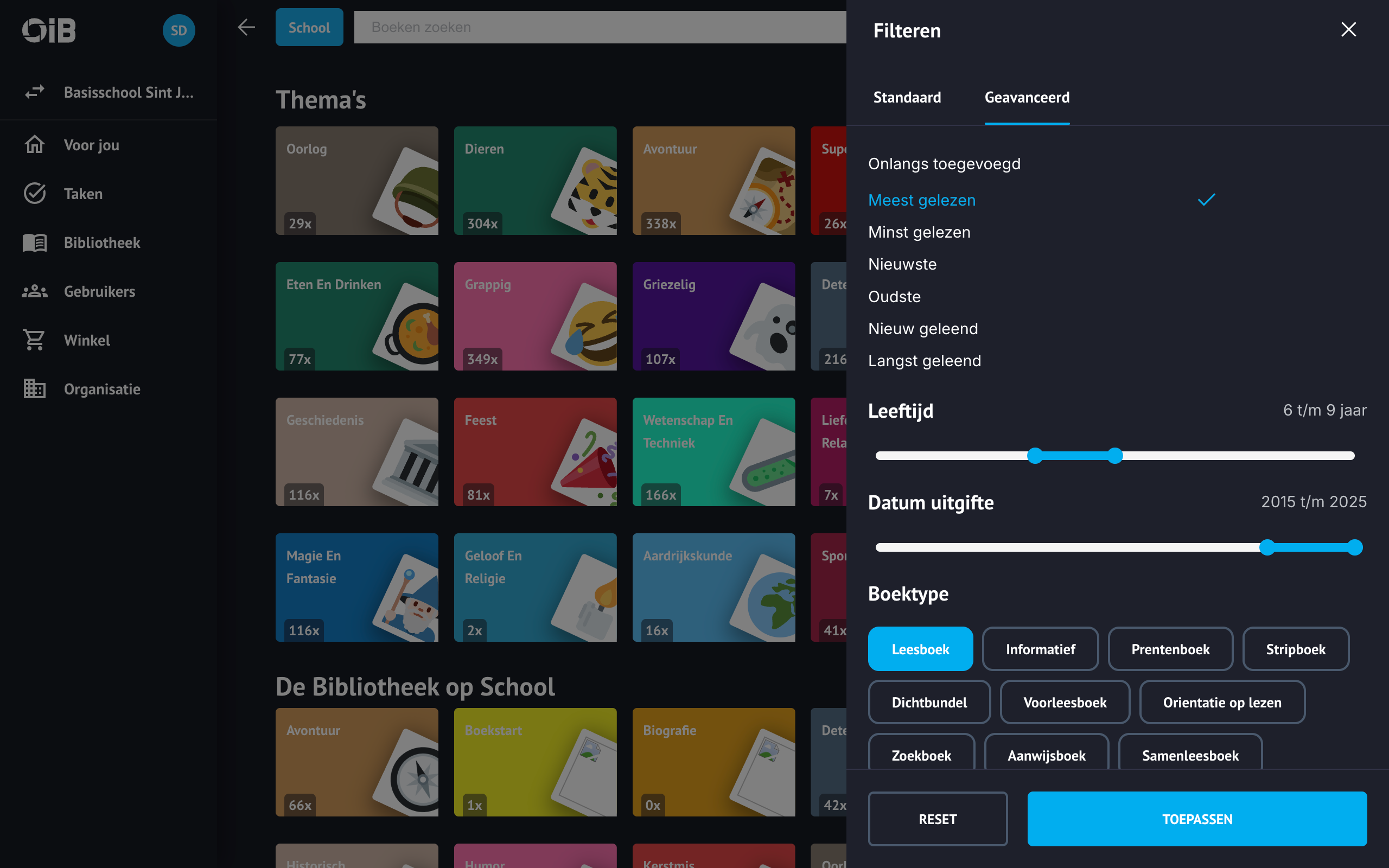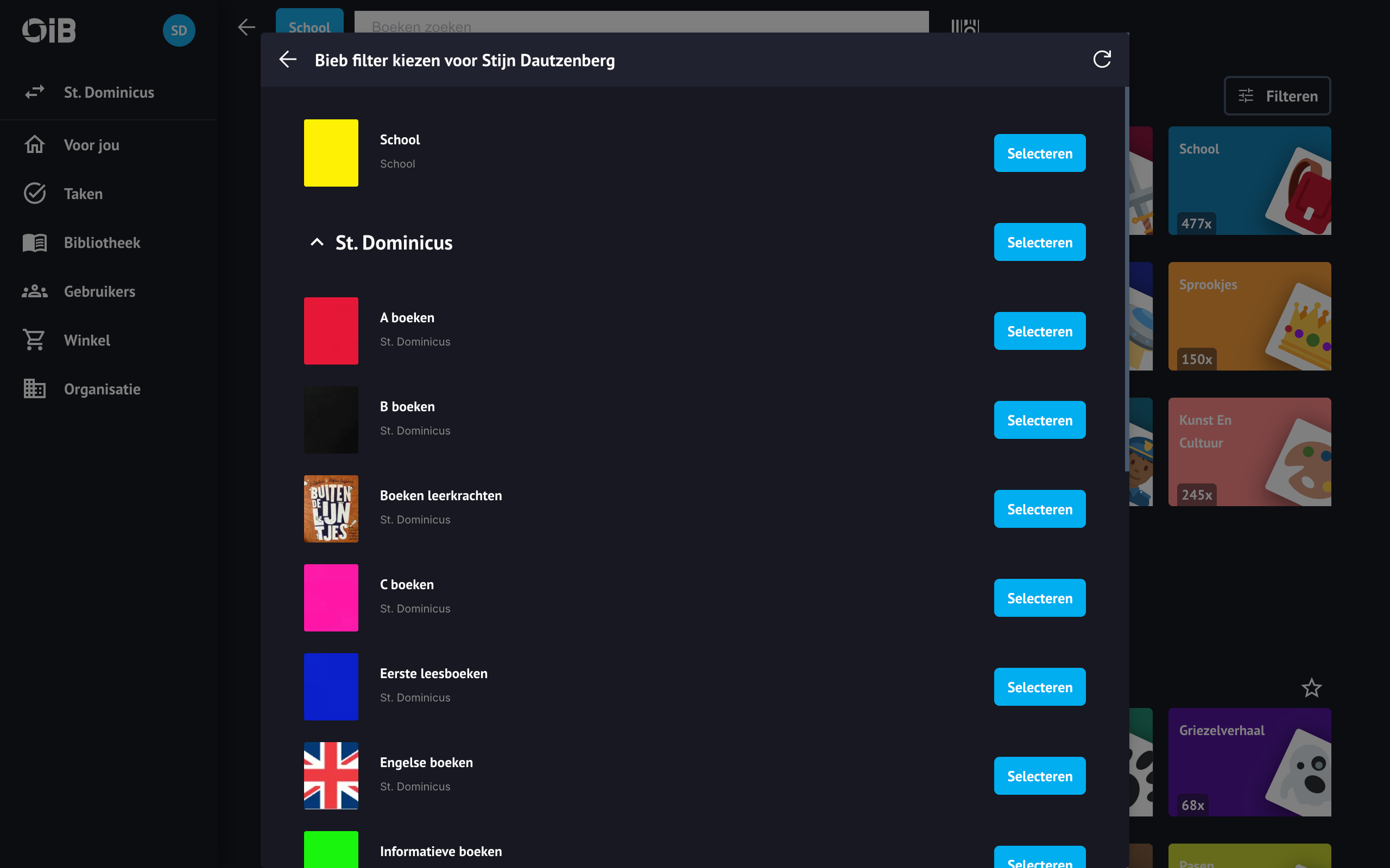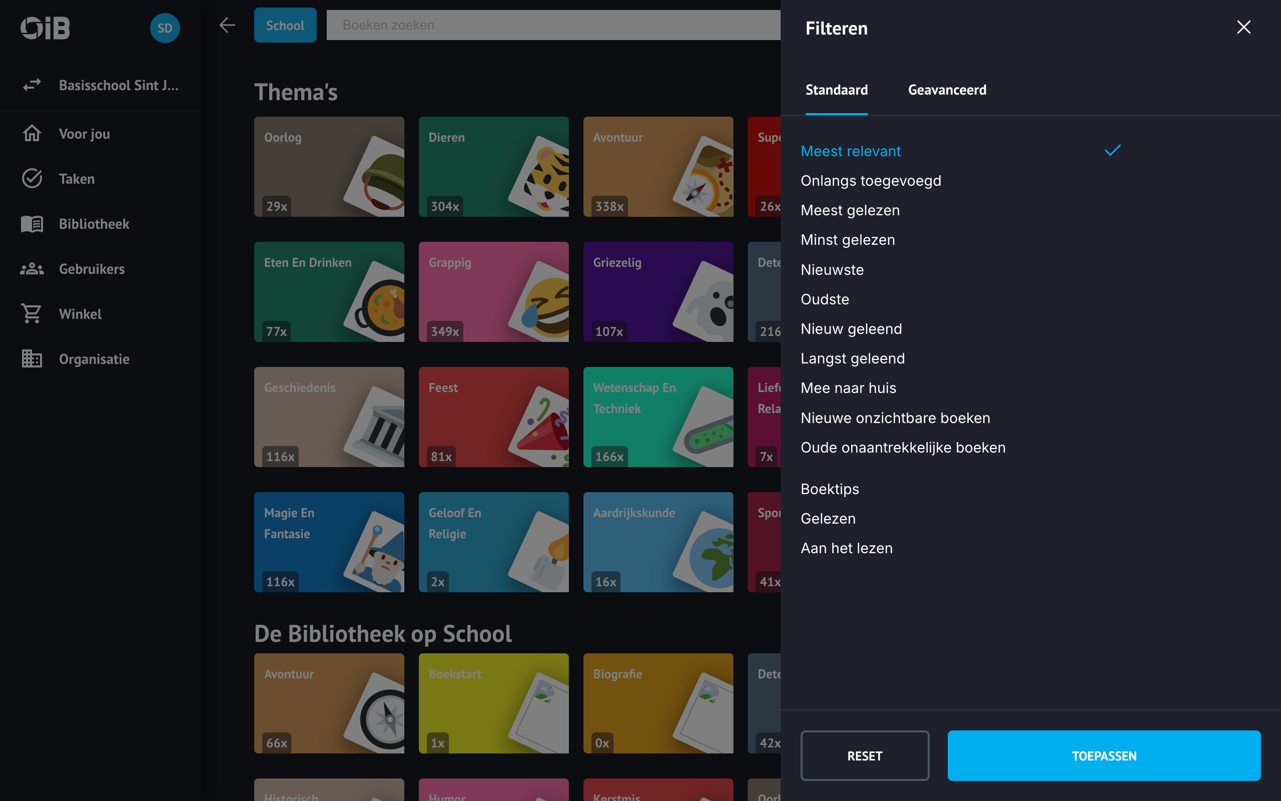 Kies vervolgens de locatie of boekenplank waarop je wilt filteren. Wil je weer in zoeken in alle boekenplanken waar je toegang toe hebt? Selecteer dan bovenaan de lijst de filter school om alles te resetten.