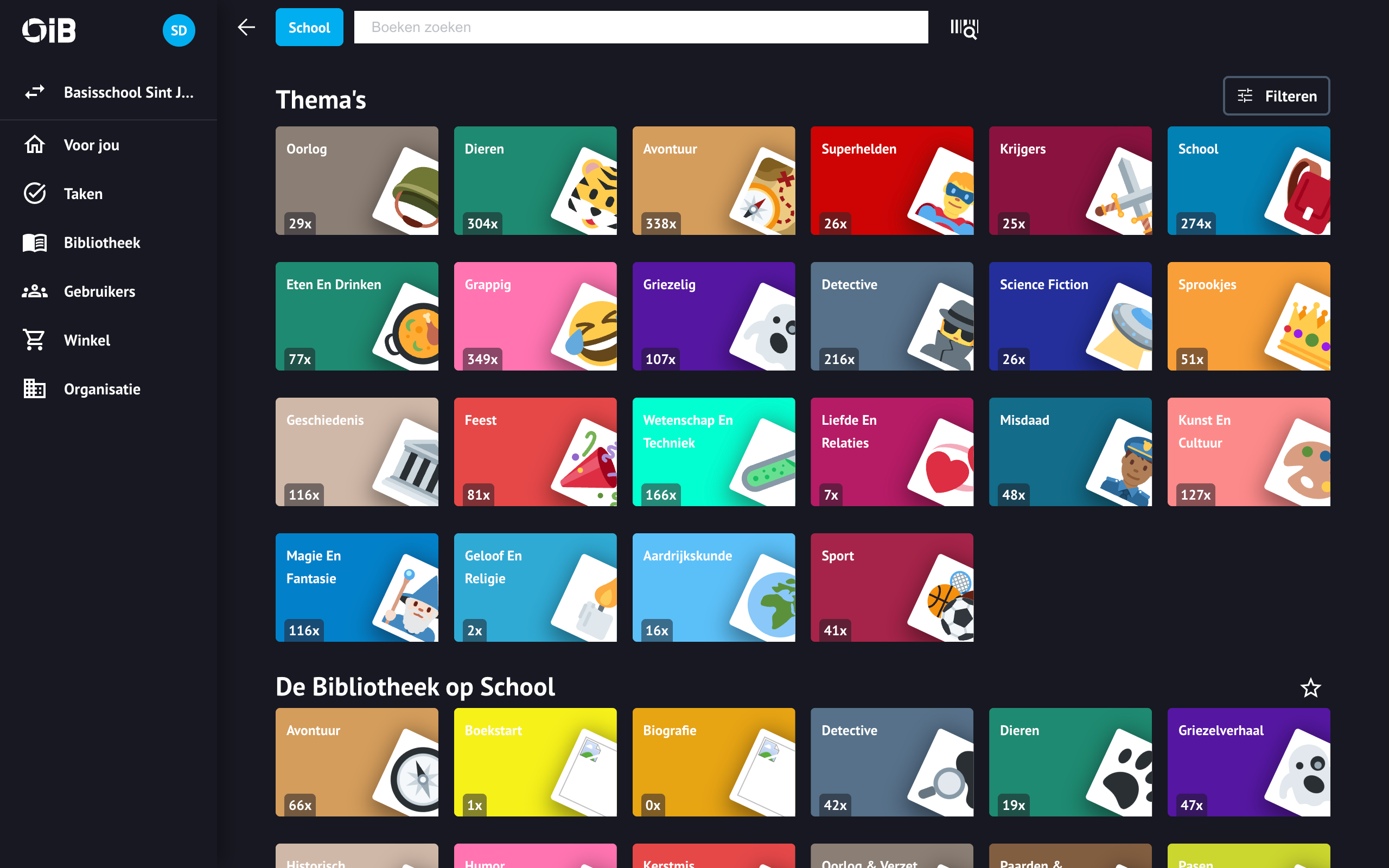 Op elke tegel zie je daarnaast hoeveel boeken binnen je huidige selectie boekenplanken bij dat thema horen.