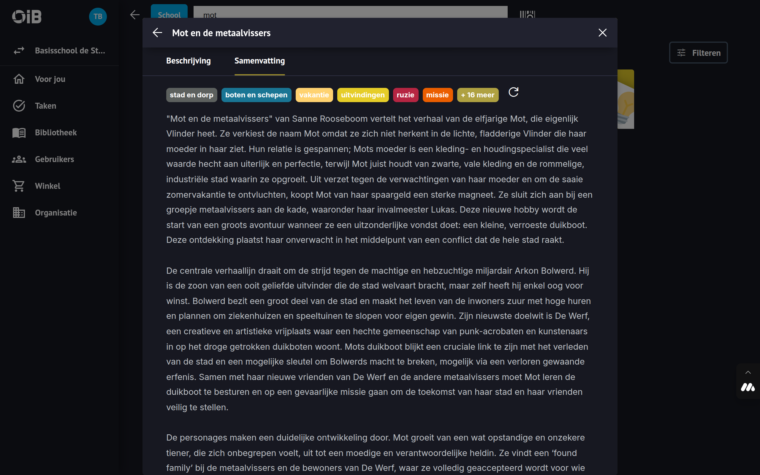 Voorbeeld: thema’s zoals wetenschap, avontuur, schoolverhaal zijn de globale thema's van Mot en de metaalvissers.