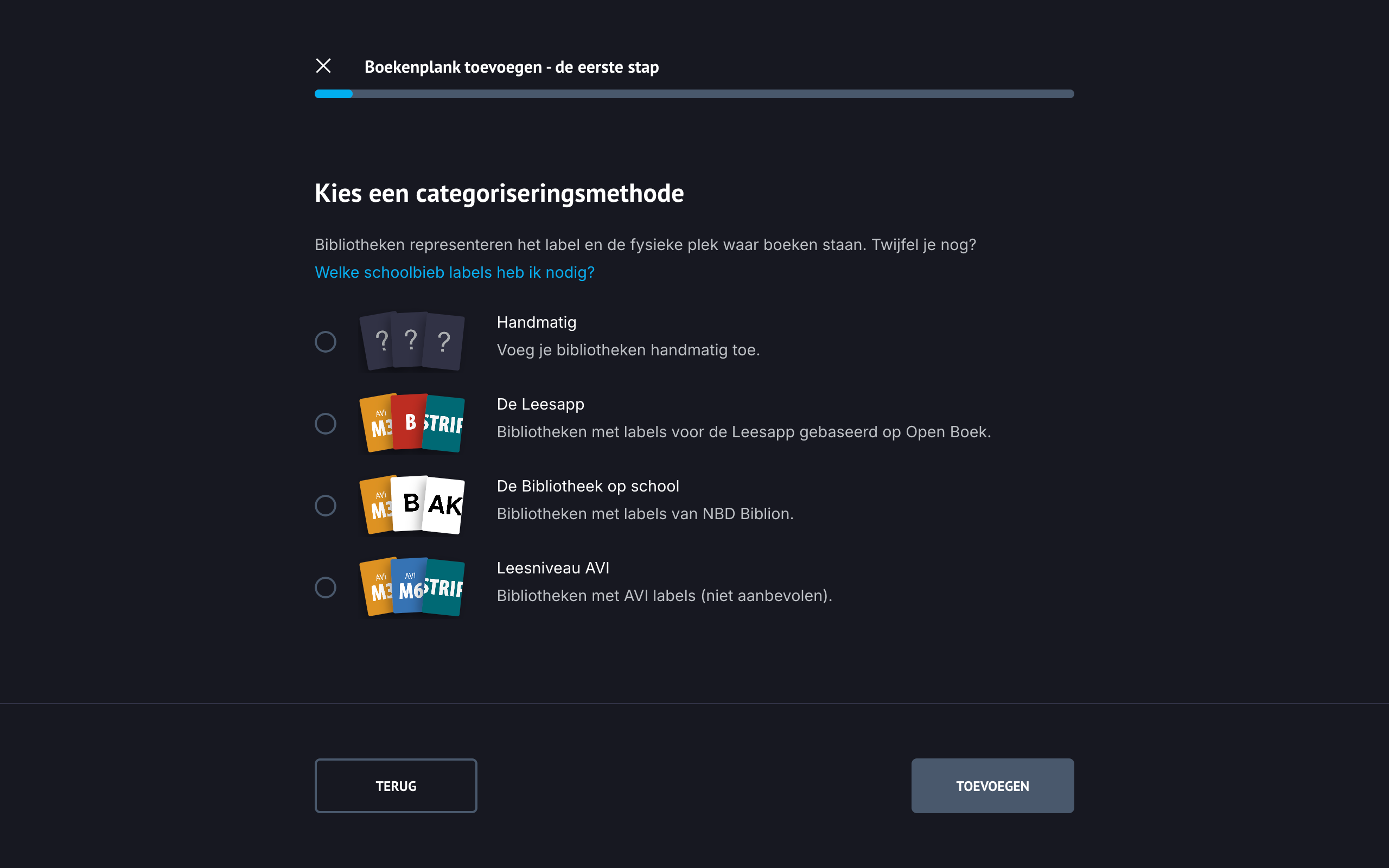 De eerste keer dat je een boekenplank toevoegt krijg je de vraag hoe je de bibliotheek wil categoriseren. De Leesapp heeft een aantal suggesties voor je klaargezet zodat je niet alle planken met de hand hoeft toe te voegen.