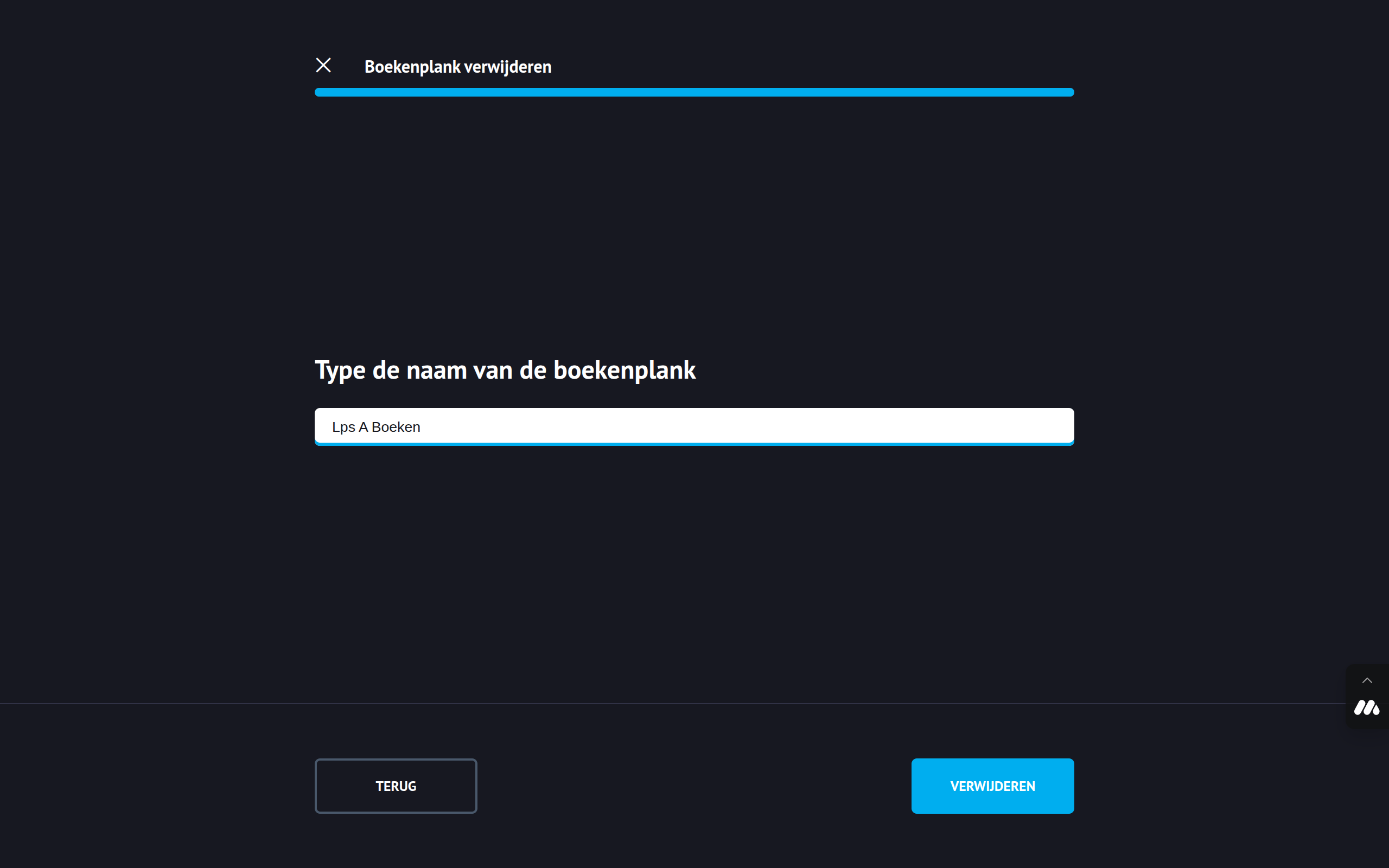 Type exact de naam van de boekenplank in en klik op de blauwe knop VERWIJDEREN.