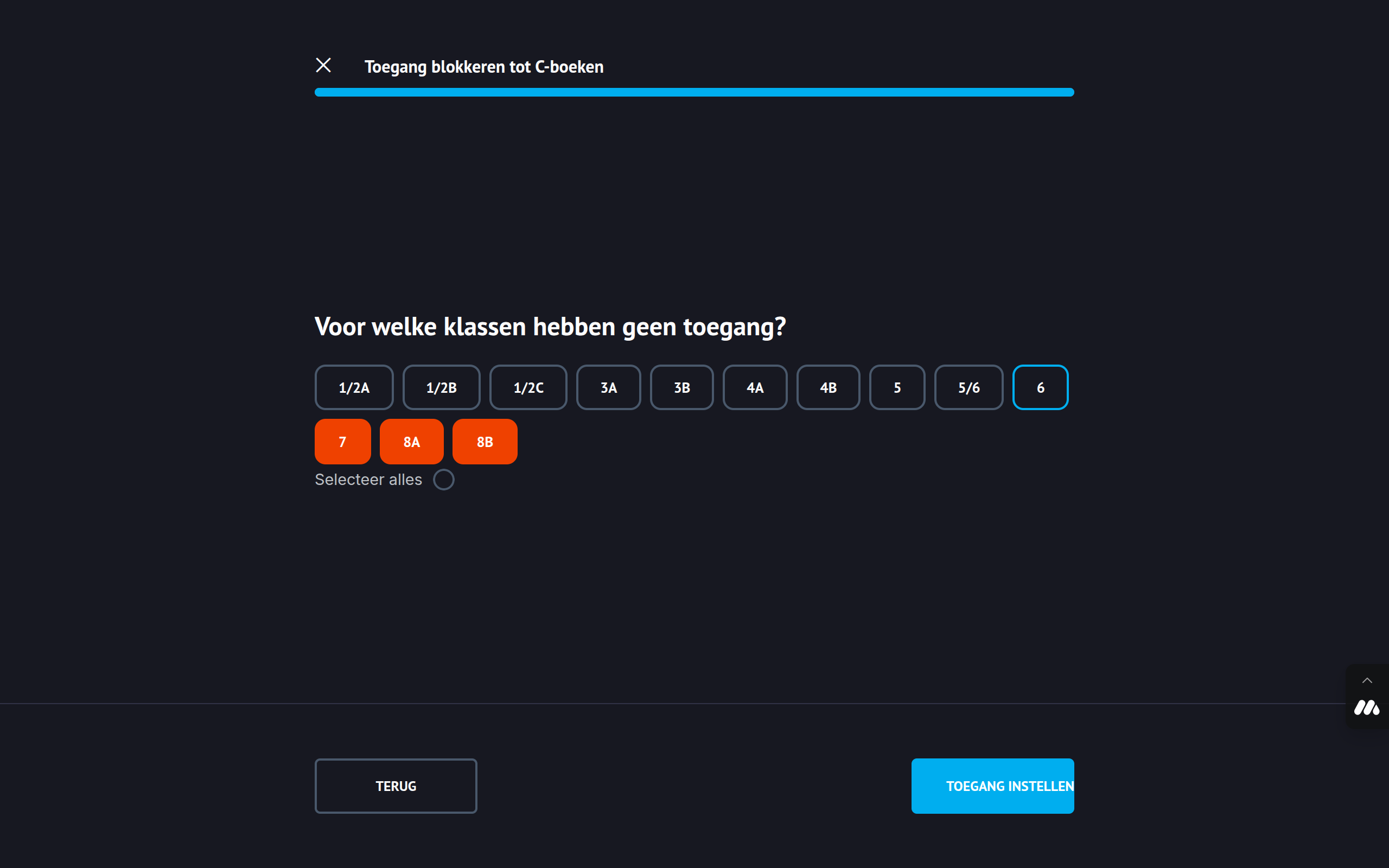 Soms wil je liever niet dat alle klassen toegang hebben tot bepaalde boekenplanken. Simpelweg omdat de boeken niet relevant voor ze zijn, zoals bijvoorbeeld de prentenboeken voor de bovenbouw of leesboeken voor 12+ voor de onderbouw. Met de optie toegang blokkeren kan je dit beheren.