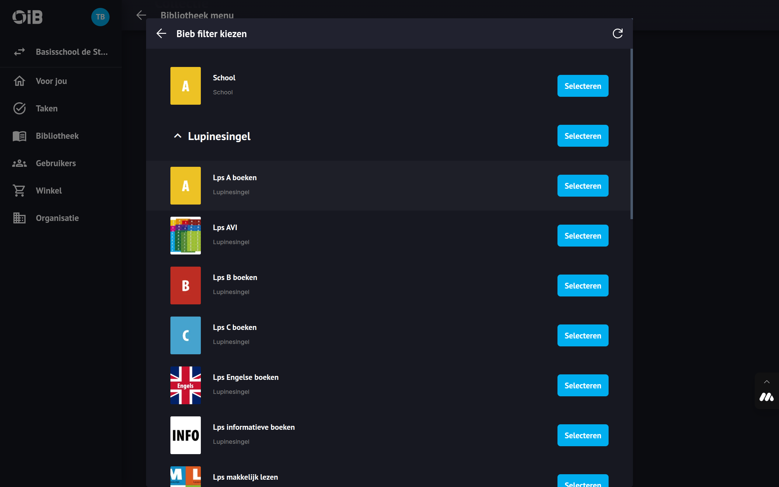 Vervolgens heb je de optie om de gehele collectie of enkel een boekenplank te downloaden. Klik op School voor de gehele collectie of in onderstaand voorbeeld op Lps A Boeken voor de boekenplank met A boeken op de Lupinsingel.
