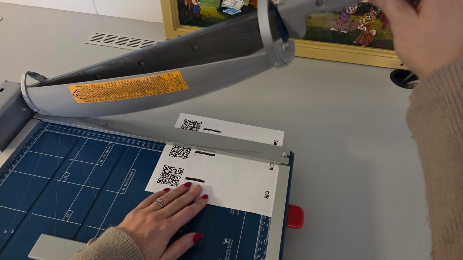 Stapel een aantal geprinte vellen op elkaar en snij ze in de snijmachine.